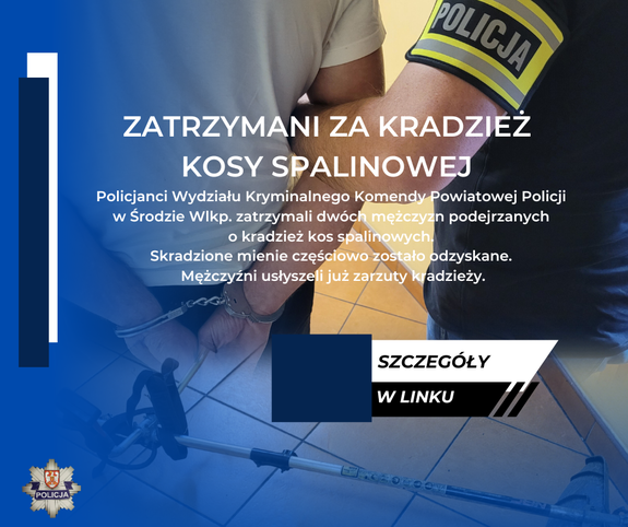 Policjanci Wydziału Kryminalnego Komendy Powiatowej Policji w Środzie Wlkp. zatrzymali dwóch mężczyzn podejrzanych o kradzież kos spalinowych. Skradzione mienie częściowo zostało odzyskane. Mężczyźni usłyszeli już zarzuty kradzieży.