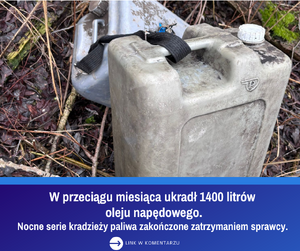 Nocne serie kradzieży paliwa zakończone zatrzymaniem sprawcy. 28- latek w przeciągu miesiąca ukradł 1400 litrów oleju napędowego.