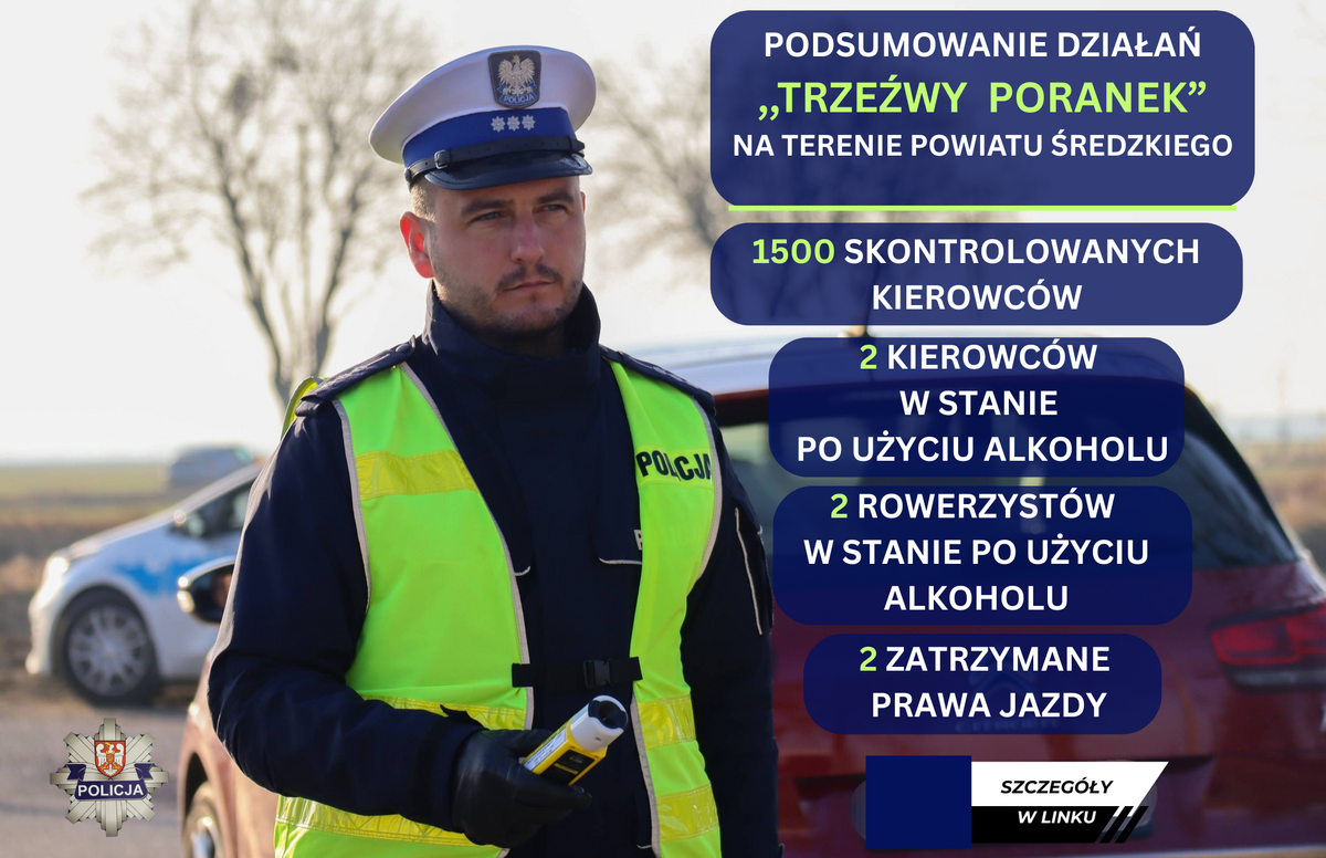 Dzisiaj (30 marca br.) średzcy funkcjonariusze od wczesnych godzin porannych prowadzili działania ,,Trzeźwy poranek". Wśród ponad 1500 skontrolowanych osób, 2 kierowców oraz 2 rowerzystów znalazło się w stanie po użyciu alkoholu.